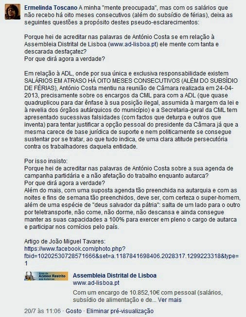 justificável sacrificar trabalhadores deixando-os sem salário por razões políticas ponderosas - que seriam as de António Costa, claro!): a de que a atitude do presidente da CM de Lisboa em relação à Assembleia Distrital (apesar de assumida à margem da lei e à revelia dos órgãos autárquicos do município e de consequências sociais gravíssimas - a privação injustificada da remuneração pode ser considerada um crime doloso) é "defender a coisa pública" ?!?!?!